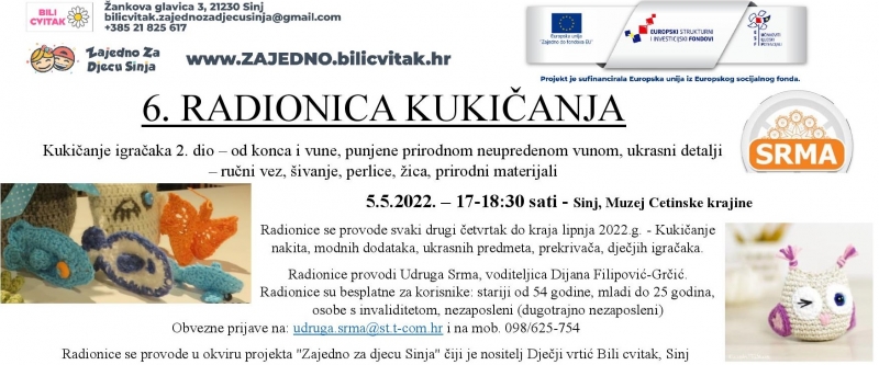 Radionice se provode svaki drugi četvrtak do kraja lipnja 2022.g. – Kukičanje nakita, modnih dodataka, ukrasnih predmeta, prekrivača, dječjih igračaka.