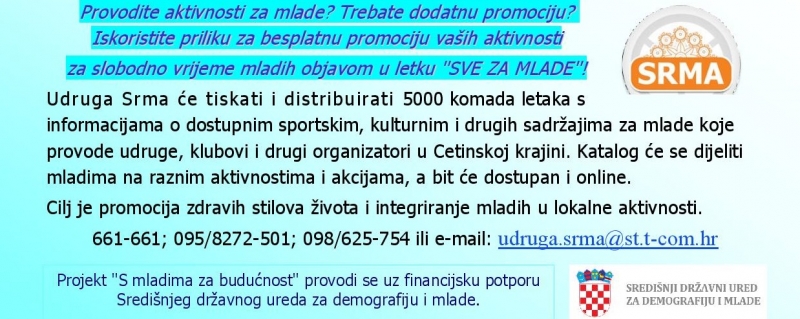 Udruga Srma će tiskati i distribuirati 5000 komada letaka s informacijama o dostupnim sportskim, kulturnim i drugih sadržajima za mlade koje provode udruge, klubovi i drugi organizatori u Cetinskoj krajini. Katalog će se dijeliti mladima na raznim aktivnostima i akcijama, a bit će dostupan i online.