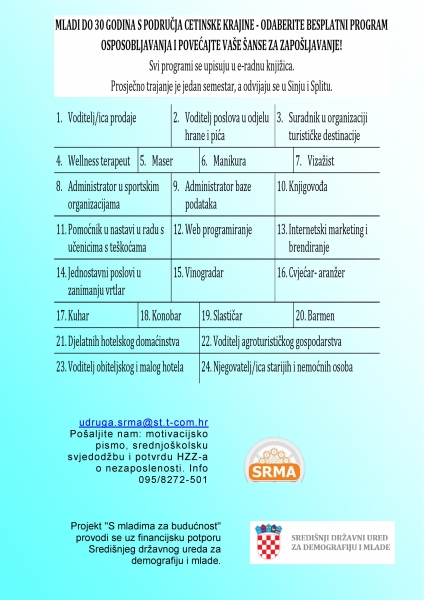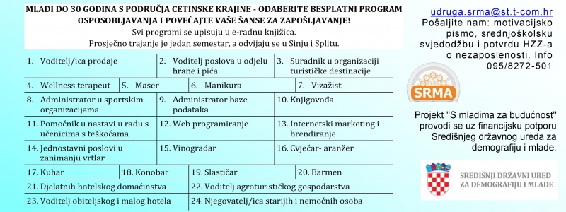 11 studenoga, 2022 M MLADI DO 30 GODINA S PODRUČJA CETINSKE KRAJINE – ODABERITE BESPLATNI PROGRAM OSPOSOBLJAVANJA I POVEĆAJTE VAŠE ŠANSE ZA ZAPOŠLJAVANJE! Svi programi se upisuju u e-radnu knjižica.Prosječno trajanje je jedan semestar, a odvijaju se u Sinju i Splitu.