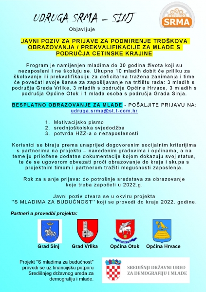 JAVNI POZIV ZA PRIJAVE ZA PODMIRENJE TROŠKOVA OBRAZOVANJA / PREKVALIFIKACIJE ZA MLADE S PODRUČJA CETINSKE KRAJINE.