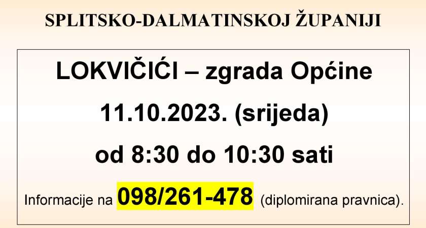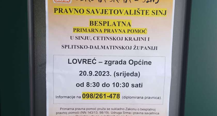 U općini Lovreć, u sklopu projekta Besplatne primarne pravne pomoći u Sinju, Cetinskoj krajini i Splitsko-dalmatinskoj županiji, održano je jučer besplatno pravno savjetovanje za sve mještane Lovreća. Na sve upite odgovarala je pravna savjetnica Marija Pupić Vurilj, a projekt je financiran od Ministarstva pravosuđa.