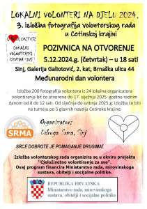 U Galeriji Galiotović u Sinju u četvrtak 5.12. u 18 sati na Međunarodni dan volontera otvara se izložba fotografija volonterskog rada u 2024.g. na području Cetinske krajine. Organizira je Lokalni volonterski centar Udruge Srma iz Sinja.