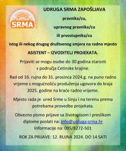 Produžili smo rok do ovog četvrtka 12.9. do 14 sati za prijave za radno mjesto asistenta – izvoditelja projekata.